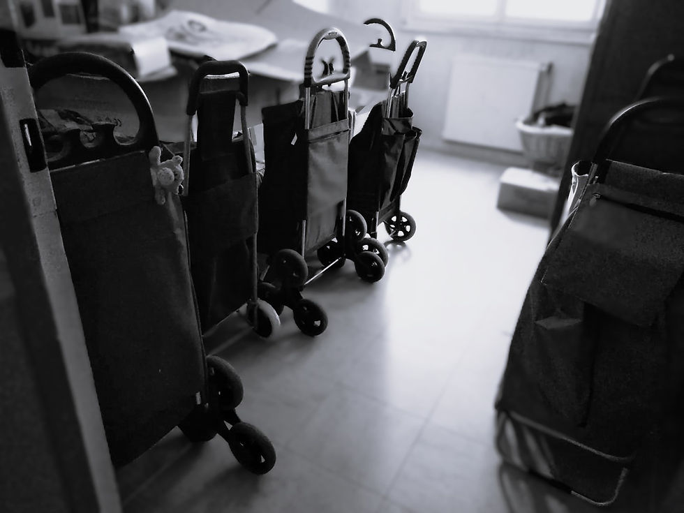 Nous avons fait de GROSSES courses. 2 caddies pleins, avec, entre autres choses, plusieurs packs de lait et d'eau. C'était laborieux à mettre dans des sacs et à porter du magasin au véhicule, puis du véhicule à son logement, en passant par l'ascenseur exigu.